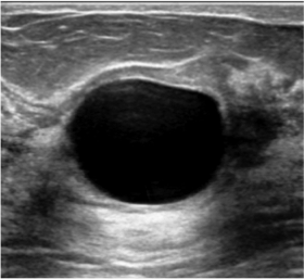 O achado mais comum na ultrassonografia das mamas é o cisto mamário. Cistos são dilatações saculares repletas de líquido, benignos na enorme maioria dos casos. Normalmente são múltiplos e bilaterais, esparsos no parênquima mamário. O cisto pode ser palpável e, nesse caso, a paciente sentirá um caroço na mama, que deve ser avaliado através da ultrassonografia a fim de comprovar a sua natureza cística (ao invés de sólida).